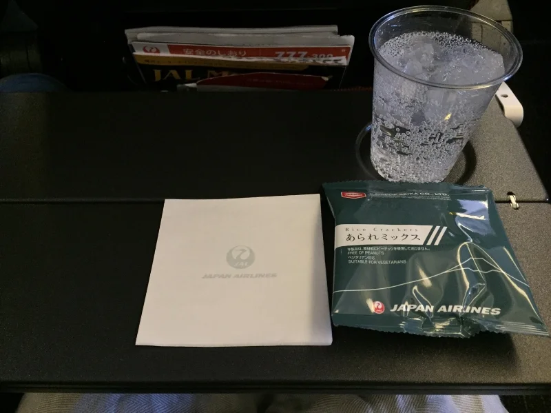さて、搭乗/離陸後すぐにドリンクとあられミックスが配られます。
