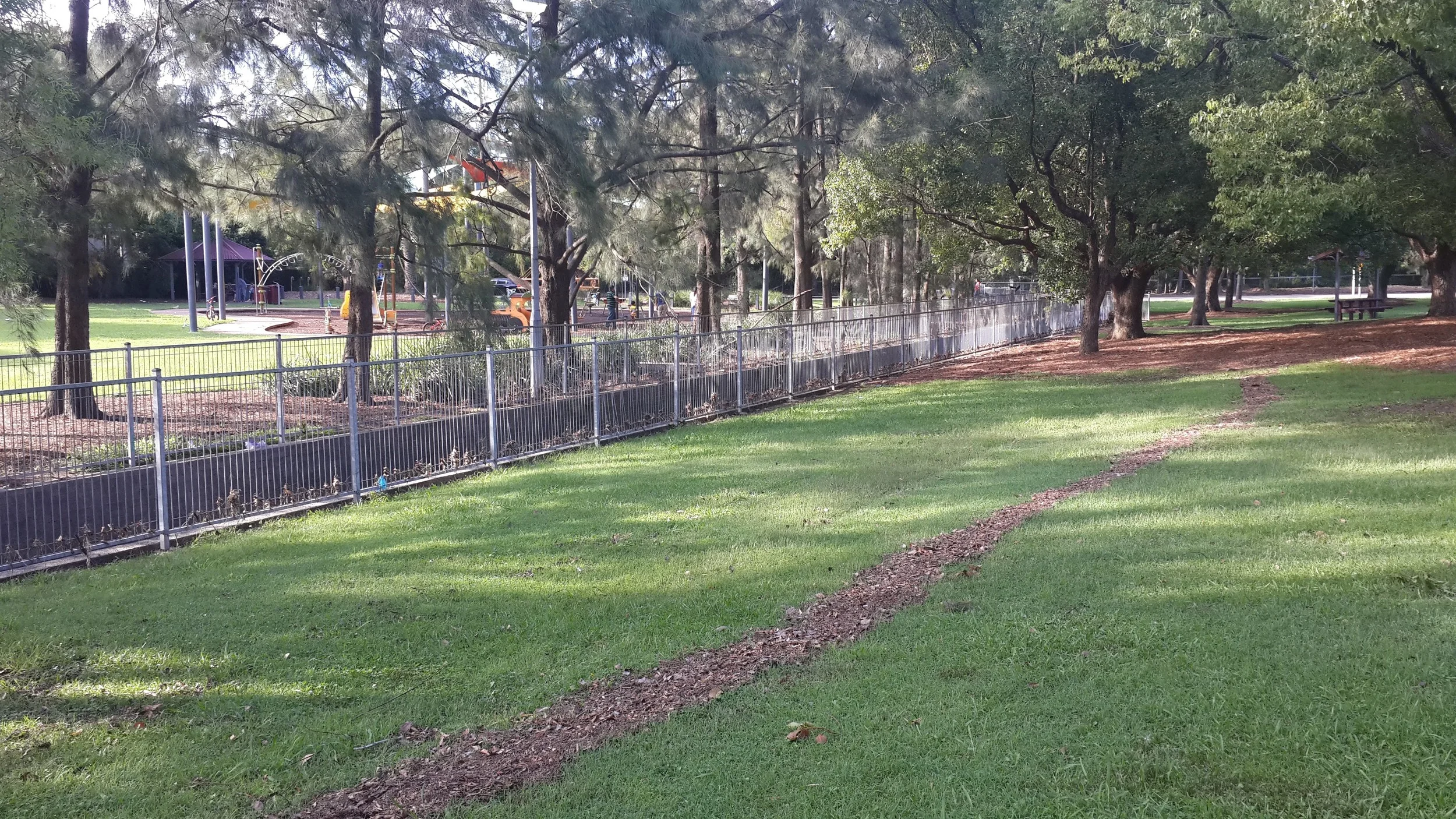 そして、芝生の真ん中に茶色い線が左手前から右奥へ続いているかと思います。この茶色いラインは、枯れ葉や小枝です。