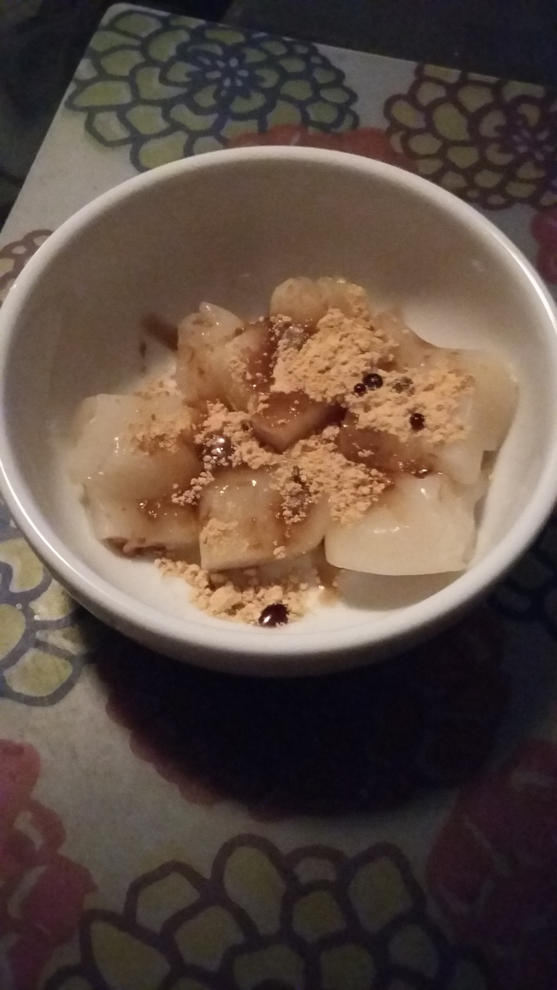 そこで、自分で簡単に作れるわらびもちの粉を買いました。お鍋で火にかけ数分⇒冷蔵庫で冷やして30分ほど。きな粉と黒蜜がついているので、好みに合わせてかけて食べることもできます!!!わらびもち自体も少し甘いので黒蜜無しでもおいしかったです。