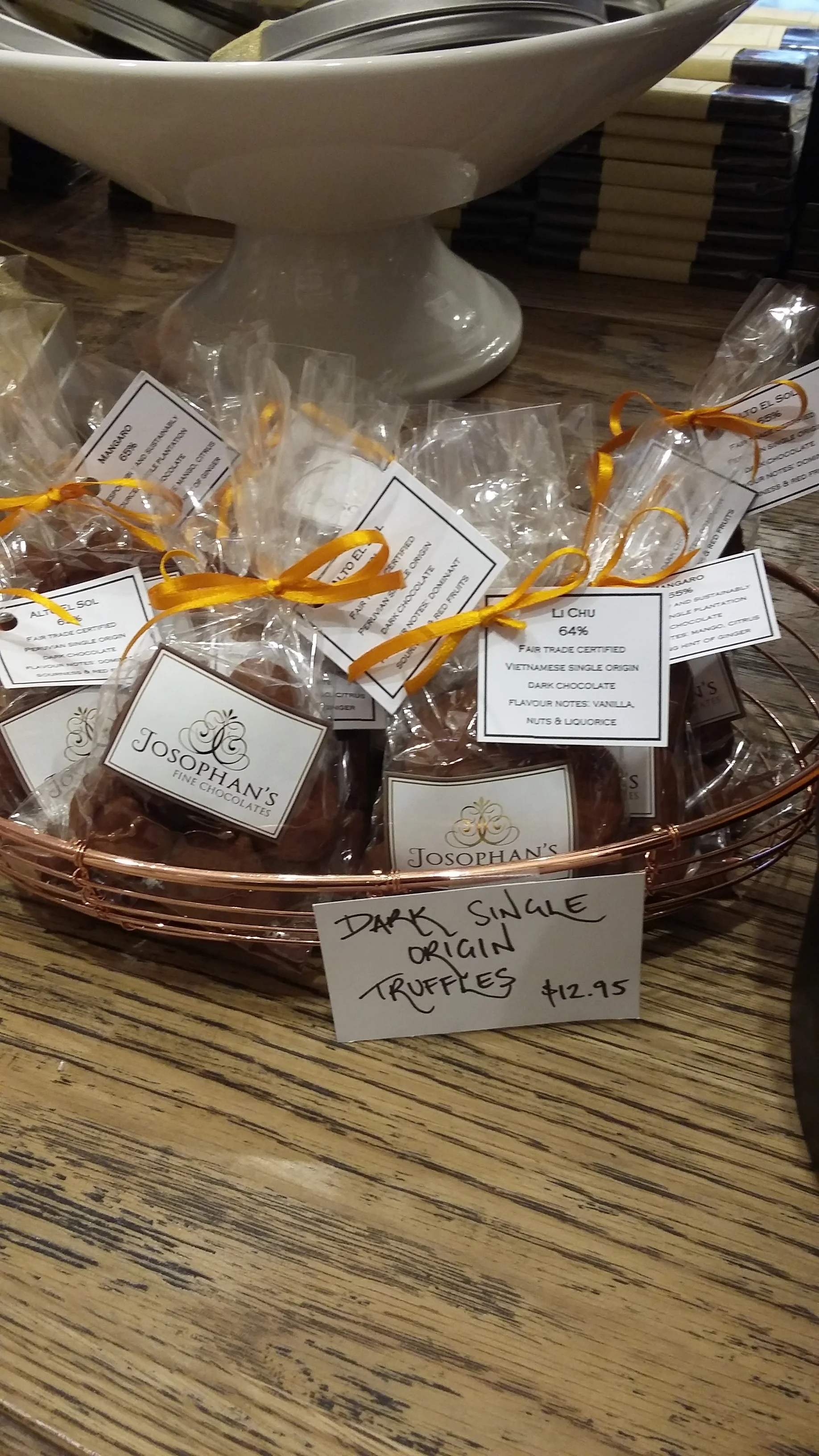 お店の名前は”Josophan's". おしゃれなチョコや可愛いチョコなど色々と美味しそうでした。私はトリュフ、生チョコ好きなのですが、写真のchocolateは5粒ほどで$13です。高いですね。。。1粒$2ちょっと。同じ値段でもっと大きいチョコレートもあったので、質を取るか量を取るか迷って、結局買わず。もう少しお手頃なら良いのにと思いつつお店をあとにしました(笑)